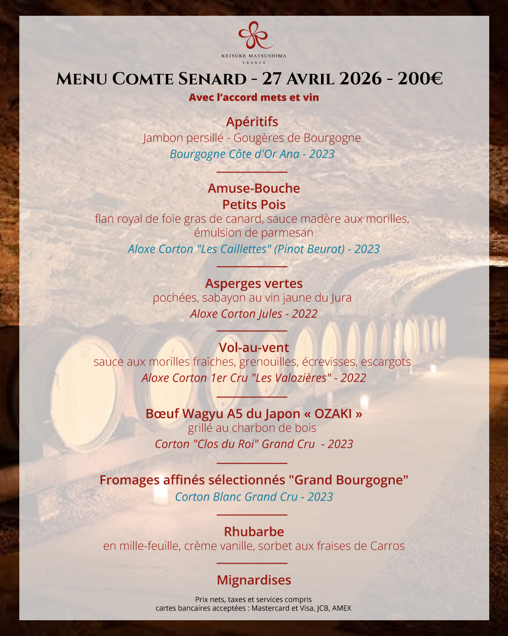 Déjeuner ou dîner chez Kei : un rituel sympathique dédié aux joies du palais et à l’inventivité. L’exigence de Keisuke Matsushima se retrouve à tous les niveaux de l’assiette qu’il propose. Du marché à la découpe, de la cuisson aux associations des saveurs, de la palette en bouche à l’harmonie des couleurs, du travail des textures à la combinaison des températures, de la rigueur de la carte à la gentillesse efficace du service.